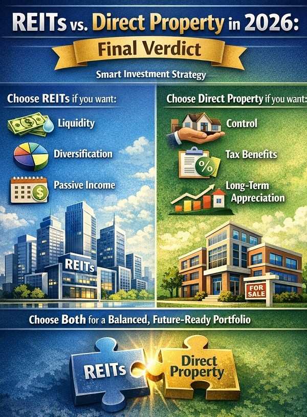 What truly defines successful investing in 2026, however, is not choosing one over the other. It is understanding how both vehicles complement each other. The smartest investors are strategically combining REITs and direct property to balance liquidity with stability, and passive income with capital appreciation.