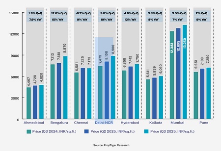 Residential prices across top cities rose sharply, led by the Delhi NCR, Bengaluru, and Hyderabad. Supported by a shift toward luxury, national weighted average prices increased simultaneously.