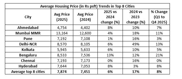 Bengaluru has experienced 13% price growth per annum, compared to 12% in 2024, and the best quarterly growth of 21% Q1 to Q4 2025, which has advanced average prices to 9500 per sq. ft. This made Bengaluru rank higher than Delhi NCR and the second most expensive residential market only to Mumbai MMR. Hyderabad came second with 8% growth, which is much better than 3% in 2024, with the growth due to infrastructure development, high IT recruitment, and better social facilities.