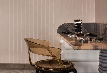 The interiors blend contemporary modern aesthetics with tactile warmth. Italian marble and custom wooden floors delineate spaces, while walls feature a grid of dyed Sukupira veneer and leather-finished Chianti white marble moldings.