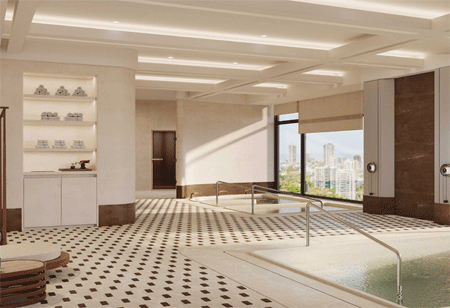 At the heart of the project lies a dedicated wellness floor curated by The Wellness AE, offering therapeutic spaces such as halotherapy, vitality pools, cold plunge, counter current pool, and steam, sauna and therapy rooms that encourage recovery and relaxation.
